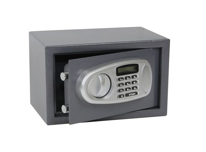 • Malý, bezpečný sejf s LCD displejem tloušťky dveří 4 mm a 2 mm pláště.