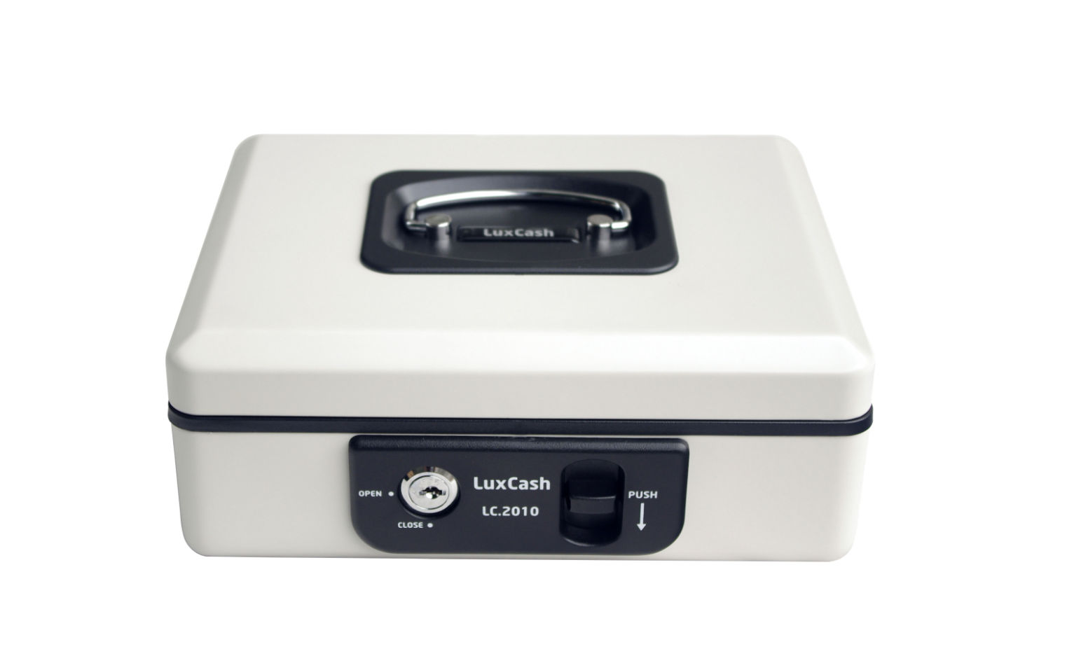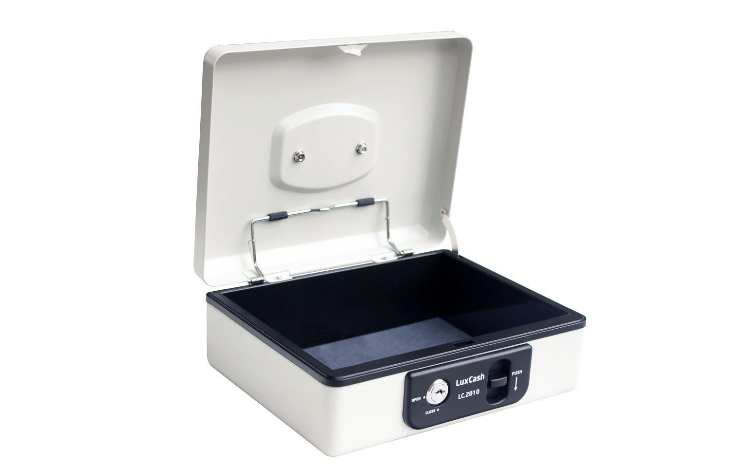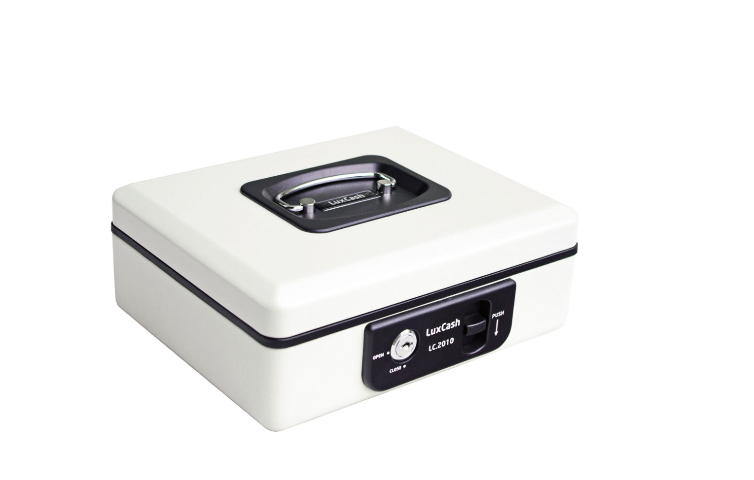 • Uzamykatelná pokladnička z ocelového plechu s blokací proti samovolnému zavření.