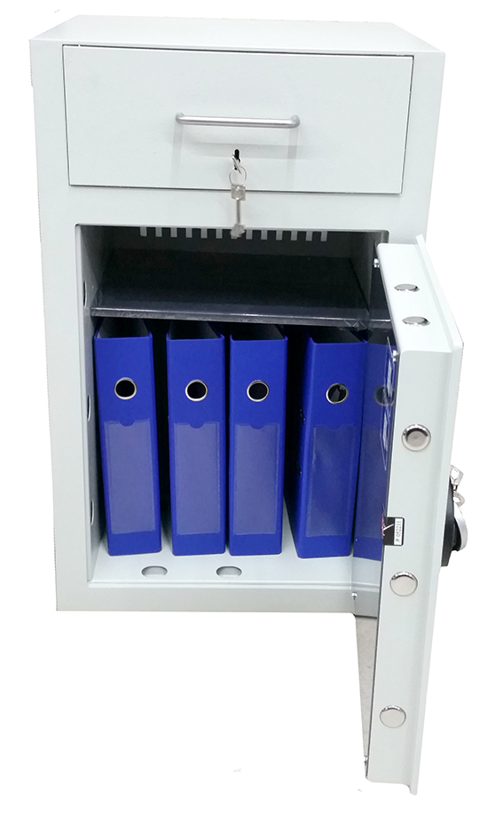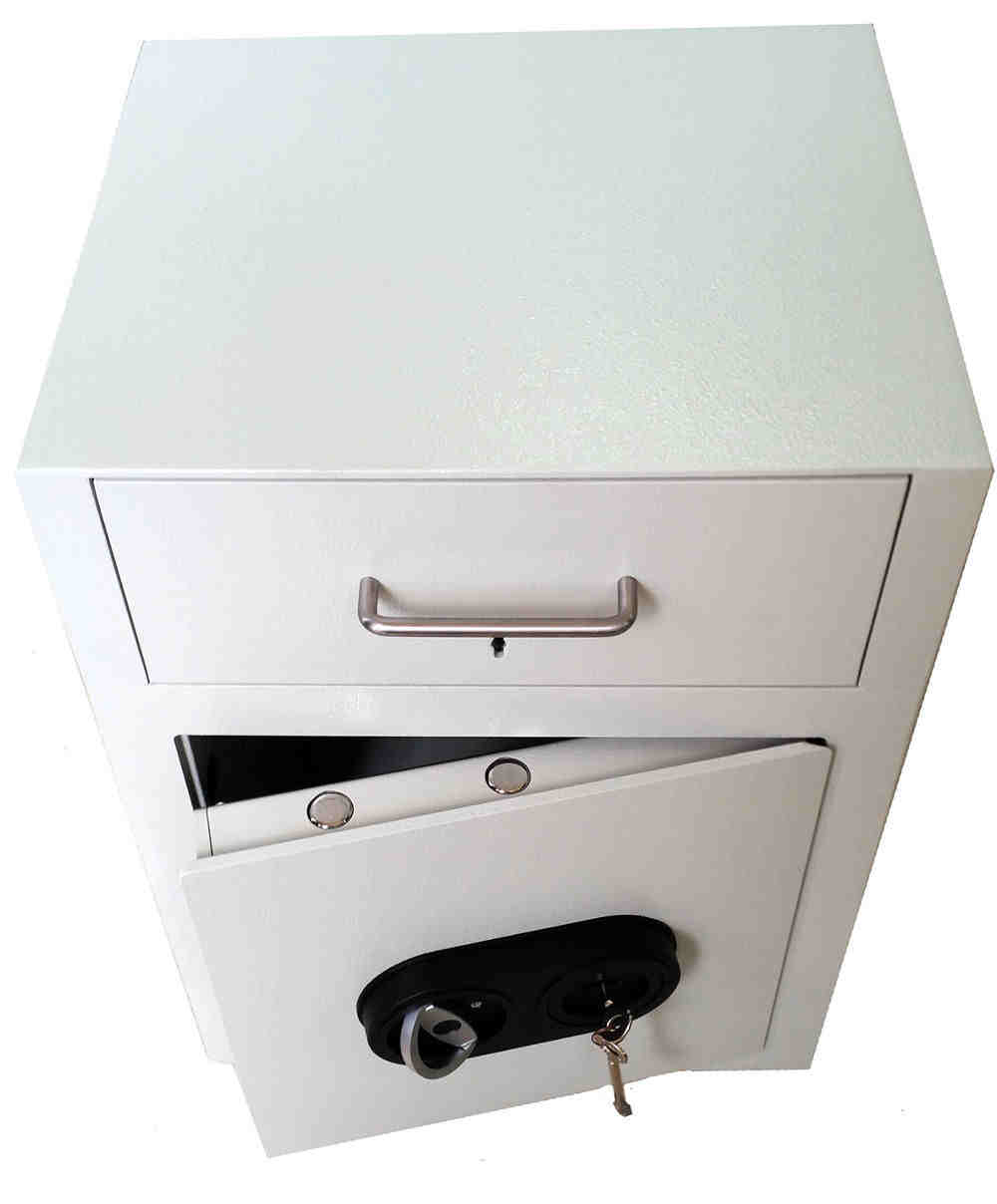 • Šuplík je osazen klíčovým trezorovým zámkem STUV, který lze na trezor navařit oboustranně tedy zvolit vhoz zadní nebo přední.